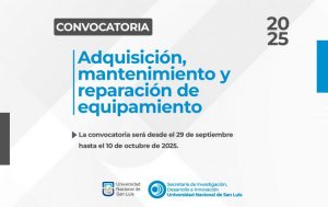 La Secretaría de Investigación, Desarrollo e Innovación de la Universidad Nacional de San Luis, en el marco de lo establecido por la OCS 9/2024, abre la convocatoria destinada a la adquisición, mantenimiento y reparación de equipamiento científico y tecnológico (Res_212-25).